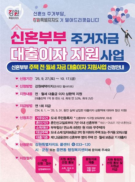한방통신사 신유철기자 기자 | 강원특별자치도는 9월 27일부터 10월 17일까지 '신혼부부 주거자금 대출이자 지원사업' 대상자를 3차 모집한다고 밝혔다.