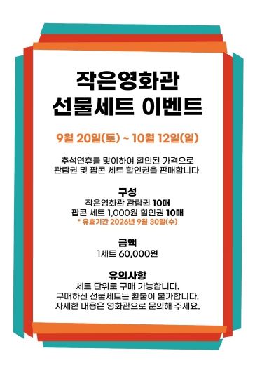 한방통신사 신유철기자 기자 | 성주별고을시네마(창의문화센터 3층)는 민족 대명절 추석을 맞아 9월 20일부터 10월 12일까지 ‘추석맞이 선물세트 이벤트’를 진행한다.