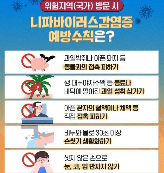 예방을 위해서는▲ 과일박쥐·돼지 등 야생동물 접촉 피하기 ▲ 오염 가능 식품(생 대추야자수액 등) 섭취 삼가 ▲ 손 씻기 등 개인위생 철저 ▲ 감염 의심 환자 접촉 피하기 등의 수칙을 지켜야 한다.