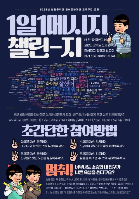 한편 한림중학교는 금요일까지 이어지는 프로그램을 통해 학생들이 자신의 언어 습관을 점검하고 바른 언어 사용이 학교 문화로 확고히 자리 잡을 수 있도록 지속적으로 노력할 계획이다.