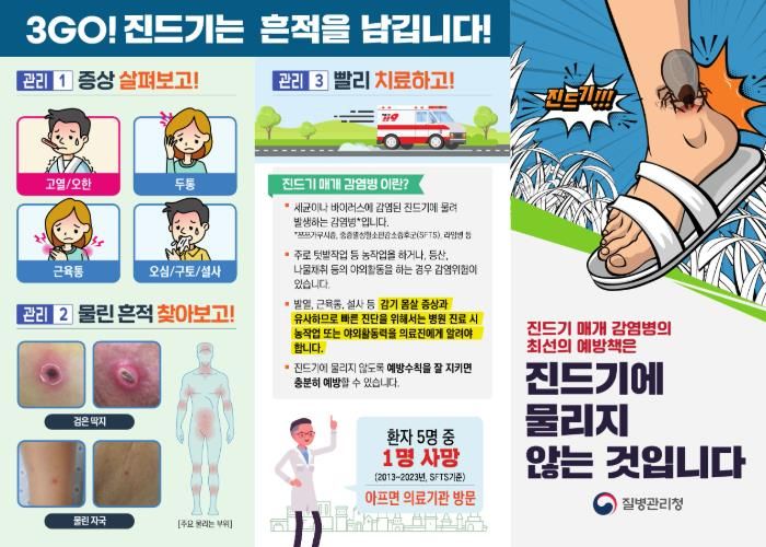 조호경 보건정책과장은 “진드기매개감염병 예방을 위한 최선의 방법은 진드기에 물리지 않는 것으로 예방수칙 준수가 가장 중요하다”며, “제초활동, 농작업 등 야외활동 후 2주 이내 발열·구토·설사 등의 증상이 나타나면 즉시 의료기관을 방문해 진료를 받아야 한다”고 말했다.