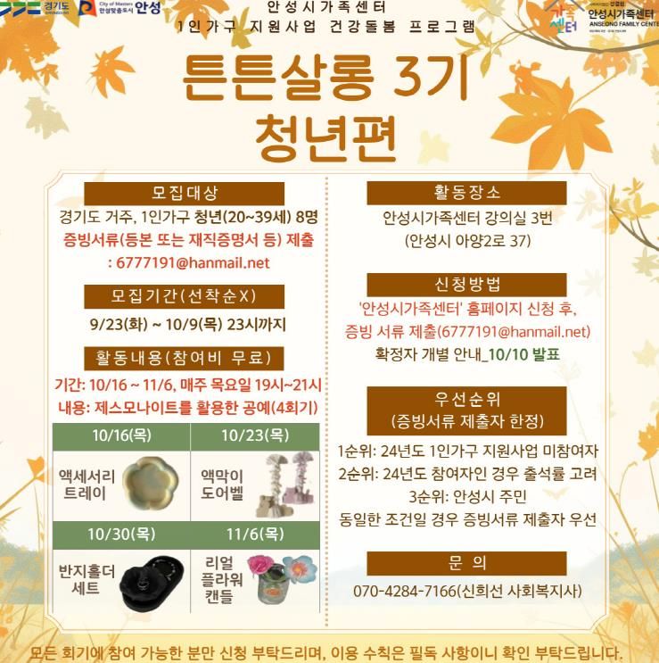 한방통신사 신유철기자 기자 | 안성시가족센터는 1인 가구 청년층을 대상으로 ‘건강돌봄 프로그램 – 튼튼살롱 3기’ 참여자를 모집한다.