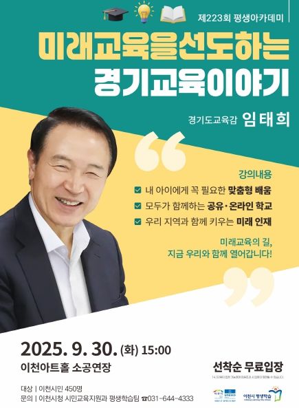 한방통신사 신유철기자 기자 | 이천시는 9월 30일 오후 3시, 이천아트홀 소공연장에서 임태희 경기도교육감을 초청해 “미래교육을 선도하는 경기교육 이야기”라는 주제로 제 223회 이천 평생아카데미를 개최한다.