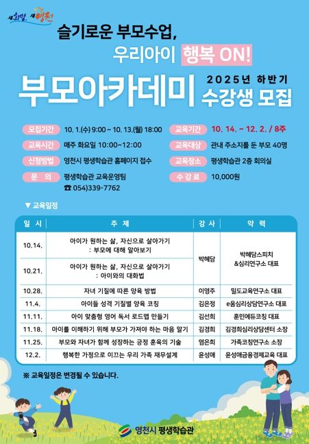 한방통신사 신유철기자 기자 | 영천시 평생학습관(관장 정경자)은 부모의 양육 역량 강화를 위한 ‘2025년 하반기 부모아카데미’ 수강생을 10월 1일부터 13일까지 모집한다고 밝혔다.