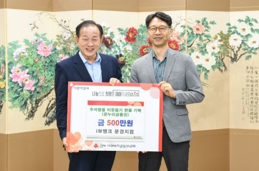 이영우 iM뱅크 문경지점장은 “작지만 따뜻한 마음을 담아 지역 이웃들에게 도움이 되고자 이번 기탁을 준비했다”며, “앞으로도 지역사회와 함께하는 나눔 문화 확산에 지속적으로 동참하겠다”고 전했다.