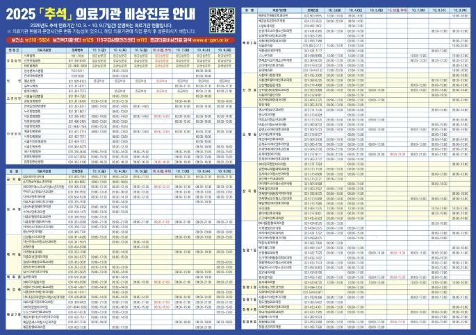 연휴 기간 중 문을 여는 의원과 약국 등 의료기관 현황은 응급의료정보센터 누리집, 시흥시 누리집, 스마트폰 앱(App) ‘응급의료정보제공’ 및 큐알코드를 통해 확인할 수 있다. 또한, 시흥시보건소, 보건복지콜센터(129), 119구급상황관리센터, 시도 전화상담실(120)을 통해서도 안내받을 수 있다.
