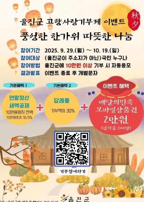 한방통신사 신유철기자 기자 | 울진군은 민족 최대 명절 추석을 맞아, 9월 29일부터 10월 19일까지 울진군 고향사랑기부제‘풍성한 한가위, 따뜻한 나눔’이벤트를 진행한다.