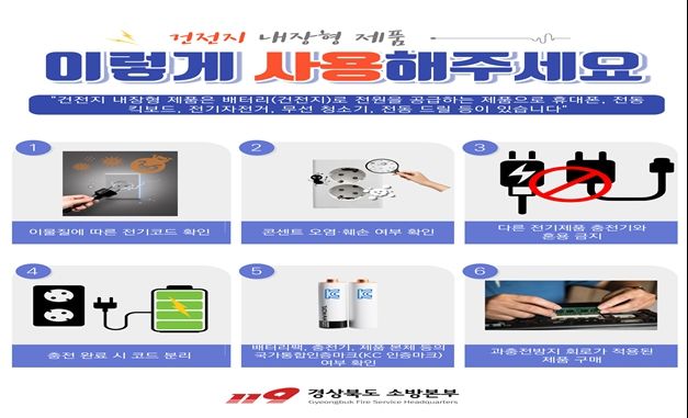 경산소방서는 배터리 내장형 제품의 안전 사용을 위해 충전 완료 후 전원 분리, 국가인증마크(KC) 확인, 과충전 방지 기본 수칙 지켜줄 것을 안내했다.