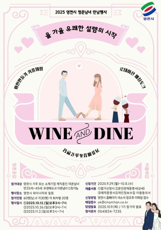 한방통신사 신유철기자 기자 | 영천시는 오는 10월 12일, 10월 26일, 11월 2일 세 차례에 걸쳐 관내 와이너리에서 미혼남녀를 위한 특별한 만남 프로그램 ‘2025 영천愛 와인·다인(wine·dine)’을 개최한다.