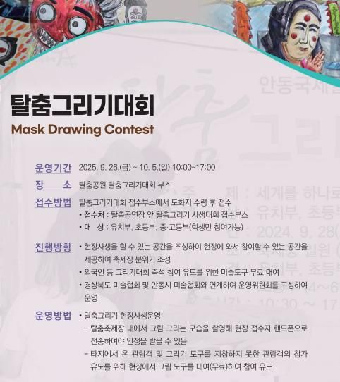 이번 대회는 어린이와 청소년들이 탈춤을 직접 그려보며 축제를 경험하고, 전통문화를 창의적인 시각으로 재해석할 수 있도록 마련된 프로그램이다.