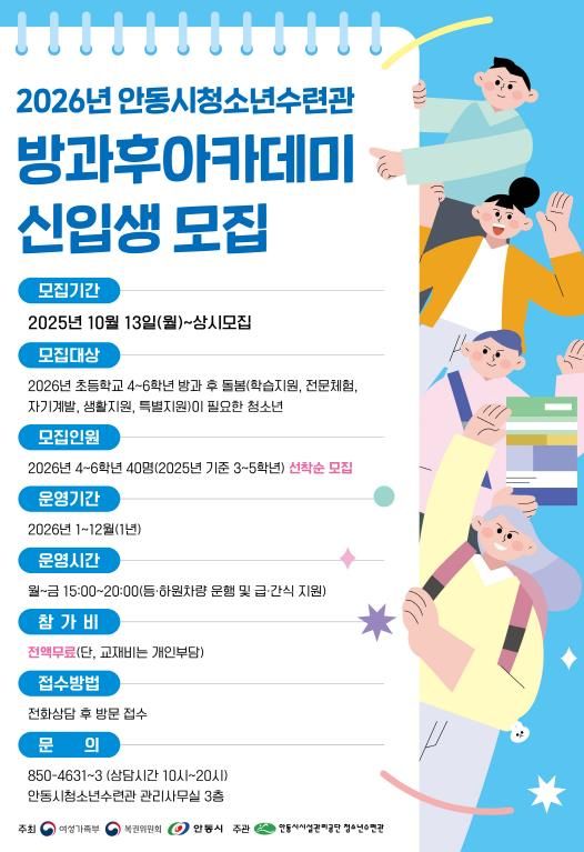 한방통신사 신유철기자 기자 | 안동시시설관리공단이 운영하는 청소년수련관 방과후아카데미가 오는 10월 13일부터 2026년도 신입생 모집을 시작한다.