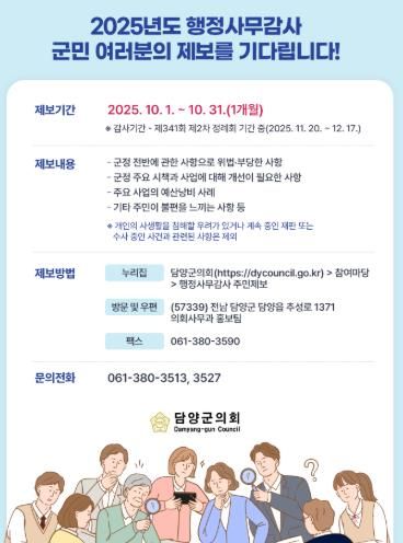 제보는 담양군의회 누리집, 이메일, 우편, 팩스 등 다양한 방법으로 제출할 수 있으며, 접수된 제보 내용은 실무 검토를 거쳐 오는 11월에 실시되는 제341회 제2차 정례회 기간 중 실시되는 행정사무감사에 적극 반영할 예정이다.