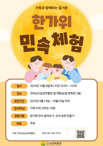 ‘한가위 민속 체험행사’는 가족 단위로 선착순 70명을 모집한다. 참가 신청은 농업박물관 누리집에서 10월 3일까지 접수하며, 참가비는 무료다.