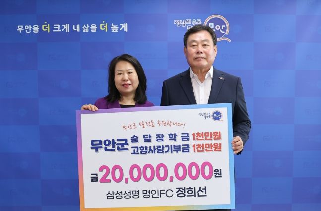 한방통신사 신다은기자 기자 | 전남 무안군은 1일 삼성생명 정희선 명인FC가 지역 인재 양성과 지역 발전을 위해 소중히 써달라며 승달장학금 및 고향사랑기부금 각 1천만 원, 총 2천만 원을 기탁했다고 밝혔다.