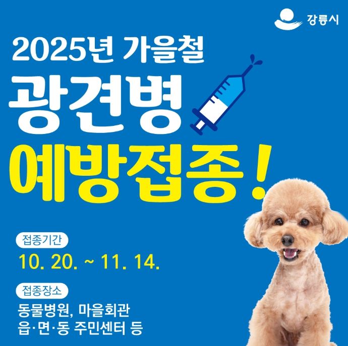 한방통신사 양호선기자 기자 | 강릉시는 인수공통전염병으로 알려진 광견병으로부터 시민과 반려동물을 안전하게 보호하기 위해 오는 10월 20일부터 11월 14일까지 4주간 가을철 광견병 예방접종을 실시한다.