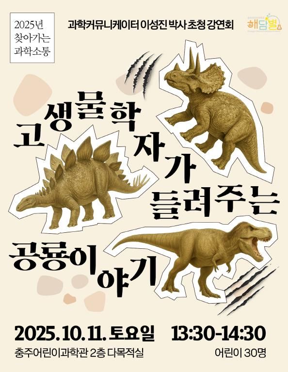 한방통신사 권영분기자 기자 | 충주어린이과학관은 오는 10월 11일, 과학커뮤니케이터로 활동 중인 고생물학자 이성진 박사를 초청해 초등 저학년 어린이를 위한 특별 강연 ‘고생물학자가 들려주는 공룡 이야기’를 개최한다고 밝혔다.
