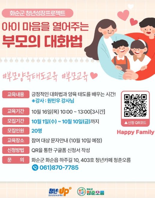 한방통신사 신다은기자 기자 | 화순군은 2일 청년성장 프로젝트 공모사업의 일환으로 개인별 맞춤형 부모 교육 프로그램을 진행한다고 밝혔다.