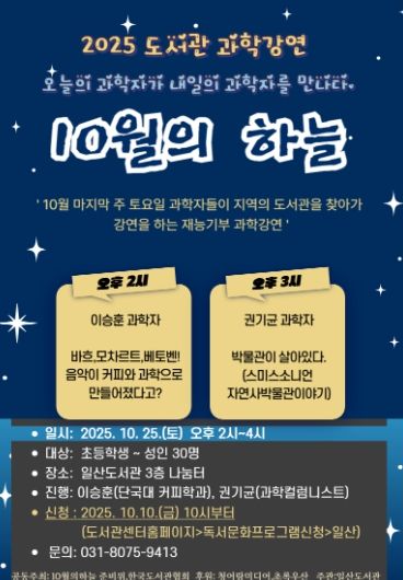 한방통신사 신유철기자 기자 | 고양특례시 일산도서관에서는 과학자들의 재능기부 도서관 과학 강연프로그램 ‘10월의 하늘’을 운영한다.