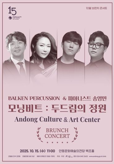 한방통신사 신유철기자 기자 | 안동문화예술의전당은 매월 둘째 주 수요일, 클래식 애호가들을 위한 감성 콘서트 시리즈인 ‘브런치 콘서트’를 꾸준히 선보이며 지역 문화 활성화에 앞장서고 있다. 10월의 브런치 콘서트, '모닝비트: 두드림'이 오는 10월 15일 오전 11시, 안동문화예술의전당 백조홀에서 열린다.