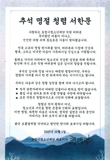 최제민 포항시청소년재단 대표이사는 서한문에서 “청렴은 단지 규범이 아니라 청소년과 시민에 대한 신뢰의 약속이자 존중의 표현”이라며, “이번 명절이 공직자의 청렴 의식을 되새기고, 투명한 행정을 실천하는 계기가 되길 바란다”고 전했다.