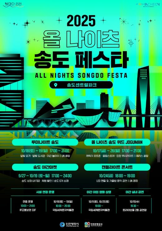 한방통신사 신유철기자 기자 | 인천광역시와 인천관광공사는 오는 10월 17일부터 26일까지 송도센트럴파크 일대에서 '2025 올 나이츠 송도 페스타'를 개최한다고 밝혔다.