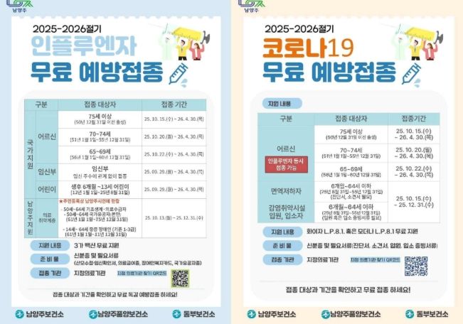 한편, 접종 일정과 지정 의료기관, 대상자 조건 등 자세한 사항은 남양주시 블로그, 보건소 누리집 등을 통해 확인할 수 있다.
