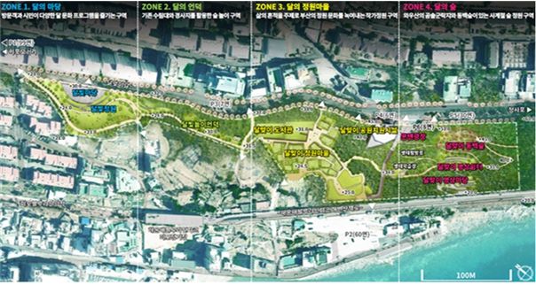 주요 시설로는 ▲문화프로그램을 즐길 수 있는 ‘달빛마당’ ▲부산의 정원문화를 녹여 낼 ‘달맞이 정원마을’ ▲건축물 리모델링을 통한 복합문화공간인 ‘달맞이 공원지원시설’ ▲건강 관리(웰니스) 공간인 ‘달맞이 명상쉼터’ 등이 조성될 예정이다.