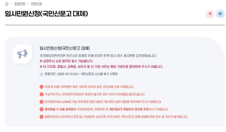 국민신문고 중단…남양주시, 누리집에 임시 민원창구 개설