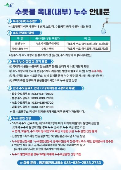 한방통신사 양호선기자 기자 | 속초시가 ‘수돗물 누수 안내문’을 제작·배포하며 생활 속 물 절약 실천 확산에 나섰다.
