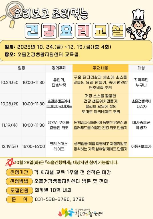 수업은 소흘건강생활지원센터 교육실에서 회차별 10명 내외 소수 정원으로 진행해 참가자가 직접 조리하는 체험 중심 실습 환경을 제공한다. 교육 내용은 저염 식단과 고혈압·당뇨 예방 식단 설계, 저당 소스를 활용한 건강식 조리, 단백질·비타민이 풍부한 균형 식단 구성, 가족 참여형 크리스마스 케이크 만들기 등을 다룬다.