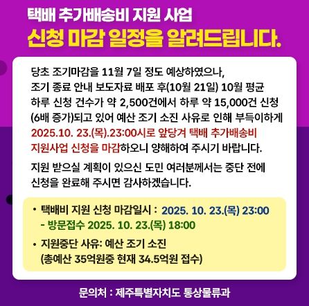 한방통신사 신유철기자 기자 | 제주특별자치도는 택배 추가배송비 지원 사업이 당초 11월 7일 종료 예정이었으나, 신청 급증으로 10월 23일 오후 11시(방문 접수 오후 6시)에 조기 종료된다고 밝혔다.