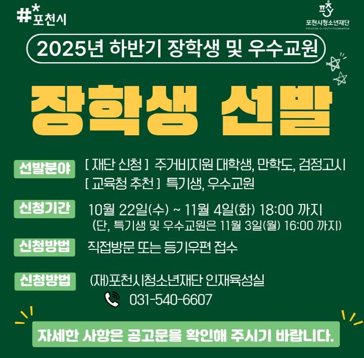 주거비 지원 대학생, 만학도, 검정고시 장학생의 신청 기간은 11월 4일까지이며, 포천시청소년재단을 방문하거나 등기우편을 통해 개별 신청이 가능하다.