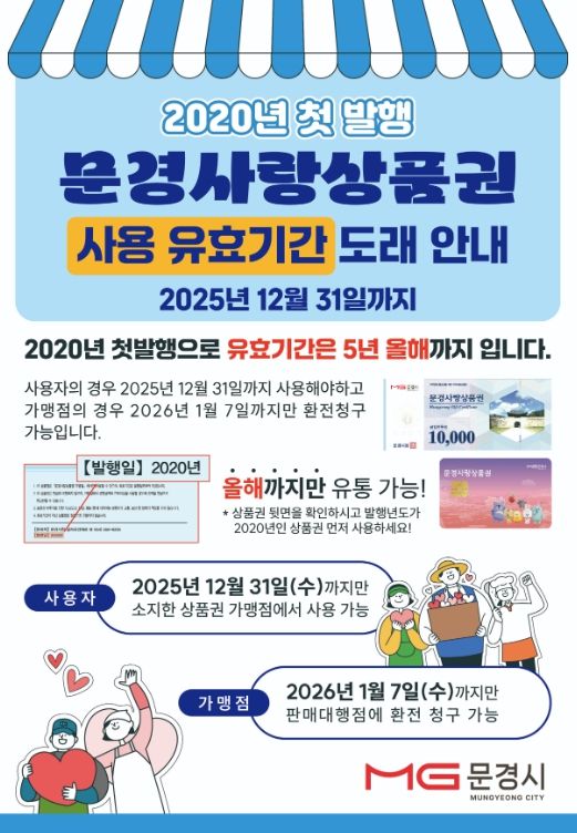 한방통신사 신유철기자 기자 | 문경시는 2020년 발행된 문경사랑상품권 유효기간이 2025년 12월 31일 종료됨에 따라 상품권을 기한 내 사용 및 환전하도록 권했다.