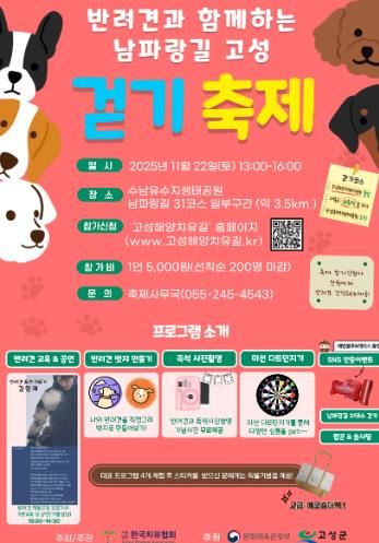 한방통신사 신유철기자 기자 | 고성군은 오는 11월 22일 수남유수지 생태공원과 대독누리길 일원에서 ‘반려견과 함께하는 남파랑길 고성 걷기축제’를 개최한다고 밝혔다.