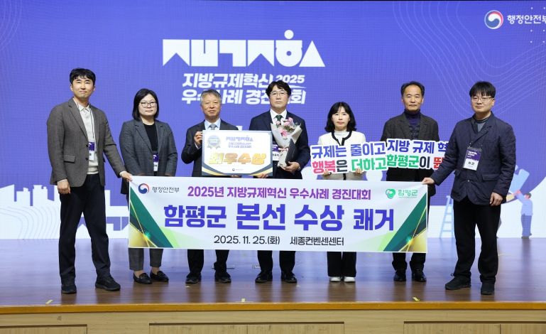 함평군은 26일 ‘농공단지 건폐율 규제 개혁’으로 행정안전부 주관 ‘2025년 지방규제혁신 우수사례 경진대회’에서 최우수상을 수상했다고 밝혔다. 경진대회는 지난 25일 정부세종컨벤션센터 국제회의장에서 개최됐다.