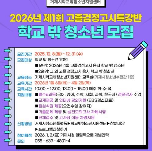 한방통신사 신유철기자 기자 | 거제시학교밖청소년지원센터는 학교 밖 청소년의 학력 취득을 돕기 위해 '2026년 제1회 고졸검정고시 대비 특강반'을 오는 2026년 1월 6일부터 4월 2일까지 운영한다고 밝혔다.