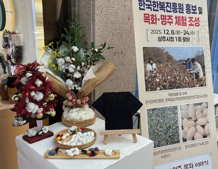 한방통신사 신유철기자 기자 | 한국한복진흥원 입주기업 누미한은 12월 8일부터 12월 24일까지 진흥원 내 목화밭에서 재배한 목화솜과 명주천을 활용한 체험형 전시를 상주시청 로비에서 진행한다.