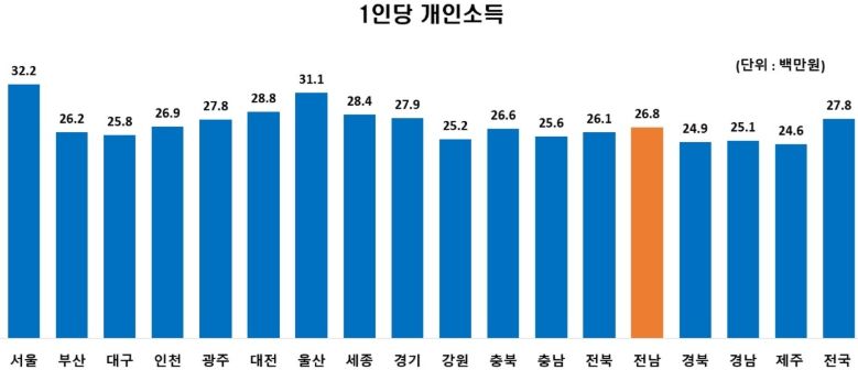전남의 1인당 총생산은 5천918만 원으로 전국 평균(4천948만 원)을 웃돌았으며, 전년보다 5.9% 증가해 전국 4위를 기록했다.