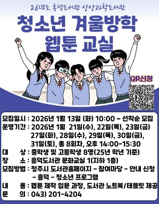 프로그램은 오는 21일부터 31일까지 총 8회에 걸쳐 청주흥덕도서관에서 진행된다. 중학생과 고등학생이면 참여 가능하다. 수업은 무료로 진행되며, 노트북과 웹툰 태블릿 등 필요한 장비는 도서관에서 제공한다.