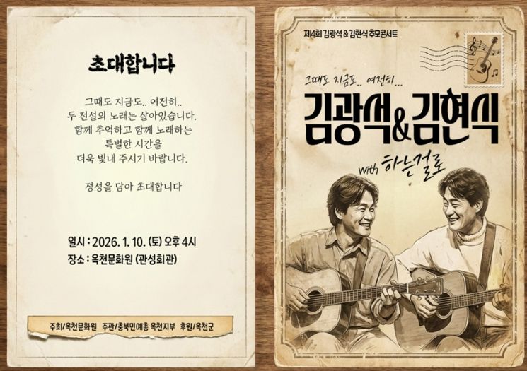 특히 ‘내 사랑 내 곁에’로 잘 알려진 김현식은 외가가 옥천에 있으며, 어린 시절 죽향초등학교에 재학하는 등 지역과 깊은 인연을 맺고 있어 이번 공연의 의미를 더욱 뜻깊게 한다.