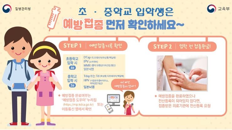 중학교 입학생은 11~12세 예방접종인 ▲Tdap(파상풍·디프테리아·백일해) 또는 Td(파상풍·디프테리아) 6차 ▲일본뇌염 불활성화 백신 5차(또는 약독화 생백신 2차), ▲ HPV(사람유두종바이러스) 1차(12세 여학생만 해당) 등 3종을 모두 접종했는지 확인해야 한다.
