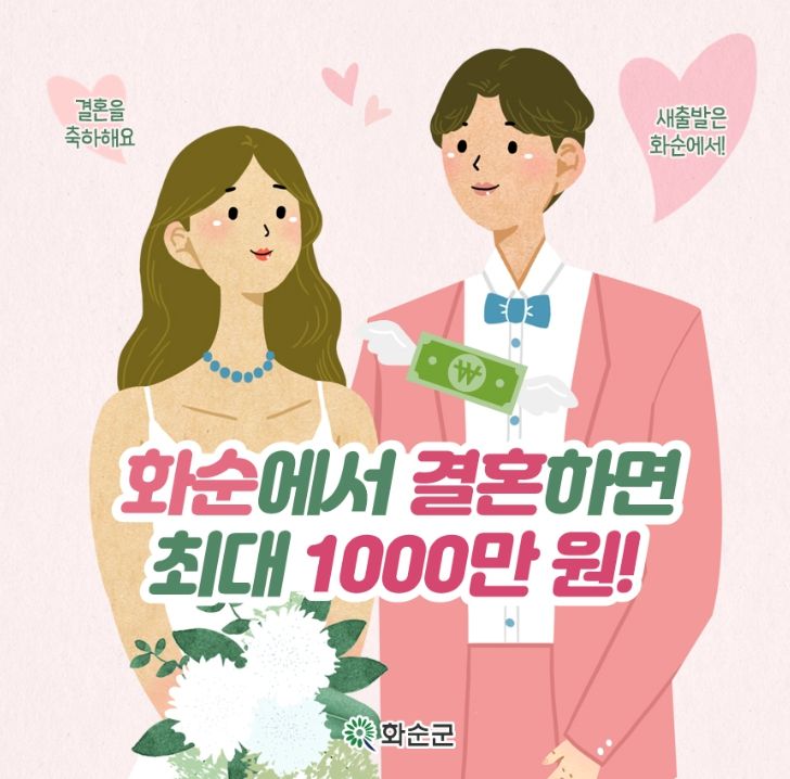 화순군은 2021년부터 전남 도내 최고 수준의 결혼장려금 제도를 시행해 결혼 초기 경제적 부담 완화와 안정적인 지역 정착을 지원하고 있다.