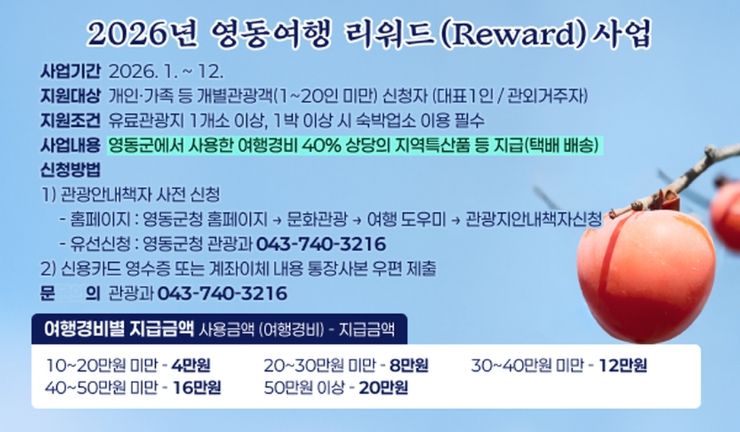 영동군 관계자는 “작년 리워드사업을 통해 예산 투입대비 7배의 지역경제 창출효과가 있었고, 2026년 리워드사업 또한 관광객의 체류를 유도하고 지역 내 소비를 촉진해 지역경제 활성화가 계속해서 이어지길 기대한다”며 “영동을 찾는 관광객들의 많은 관심과 참여를 바란다”고 말했다.