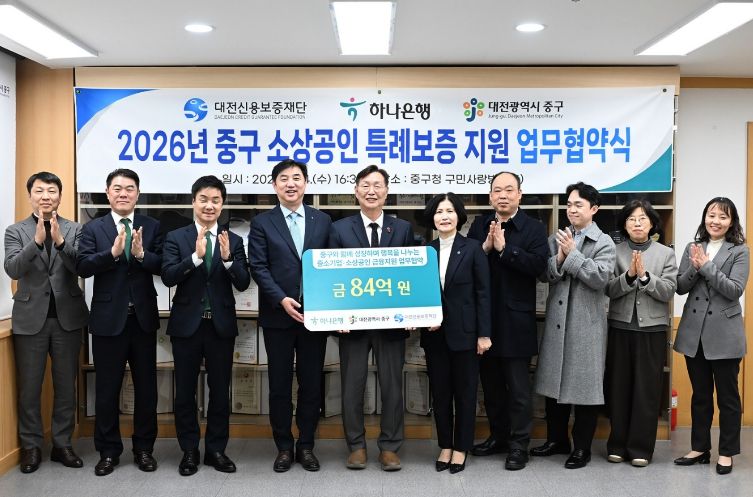 한방통신사 신태공 기자 | 대전 중구는 지난 2024년과 2025년에 이어 올해에도 중구 관내 소상공인 경영안정자금 지원을 위해 대전신용보증재단, 하나은행과 협약을 맺고 총 84억 원 규모의 소상공인 특례 보증을 지원한다고 15일 밝혔다.