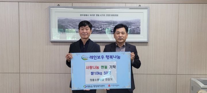 한방통신사 권영분기자 기자 | 충북 영동군 영동읍의용소방대장 민창기 씨가 어려운 이웃을 돕기 위해 16일 영동읍행정복지센터에 쌀 10kg 50포를 기탁했다.