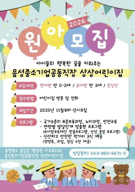 한방통신사 권영분기자 기자 | 음성군은 중소기업 근로자의 보육환경 개선과 일·가정 양립 문화 확산을 위해 운영 중인 중소기업 공동직장어린이집 ‘상상어린이집’의 원아를 모집한다.