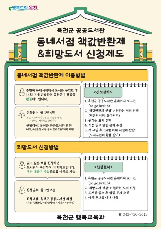 ‘동네서점 책값반환제’이용 방법은 옥천군 공공도서관 홈페이지에서 참여 서점 2개소(명륜당서점, 동아서적) 중 원하는 서점을 선택해 도서를 신청한 뒤, 도서 준비 안내 문자를 받으면 해당 서점에서 책을 직접 구입하면 된다.