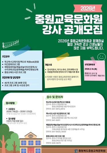 한방통신사 권영분기자 기자 | 충청북도교육청 직속기관 중원교육문화원은 23일까지 학생과 학부모, 지역주민을 대상으로 운영하는 2026년도 인문독서 및 문화예술 프로그램 강사를 공개 모집한다고 밝혔다.