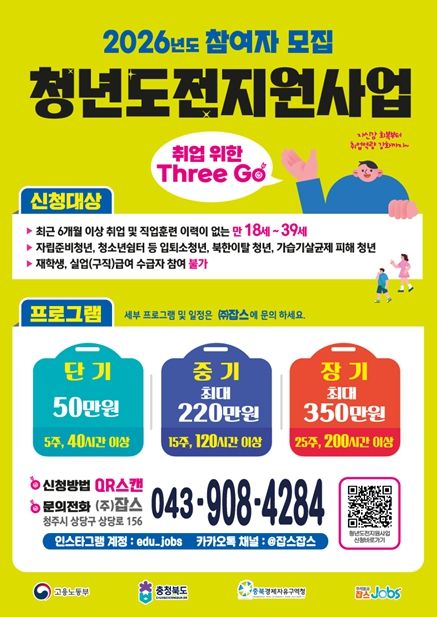 한방통신사 권영분기자 기자 | 충북경제자유구역청은 구직 의욕이 낮아진 도내 청년들의 원활한 사회 진출을 돕기 위해 고용노동부가 주관하는 ‘2026년 청년도전 지원사업’의 국비 11억 6,000만 원을 확보하고 본격적인 참여자 모집에 나선다고 밝혔다.