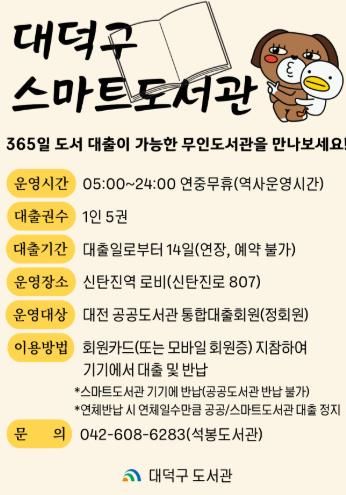 대덕구 관계자는 “스마트도서관을 통해 주민들의 독서 접근성을 높이고, 생활권 중심의 독서 문화 확산을 기대한다”며 “많은 구민 여러분의 이용을 부탁드린다”고 말했다.